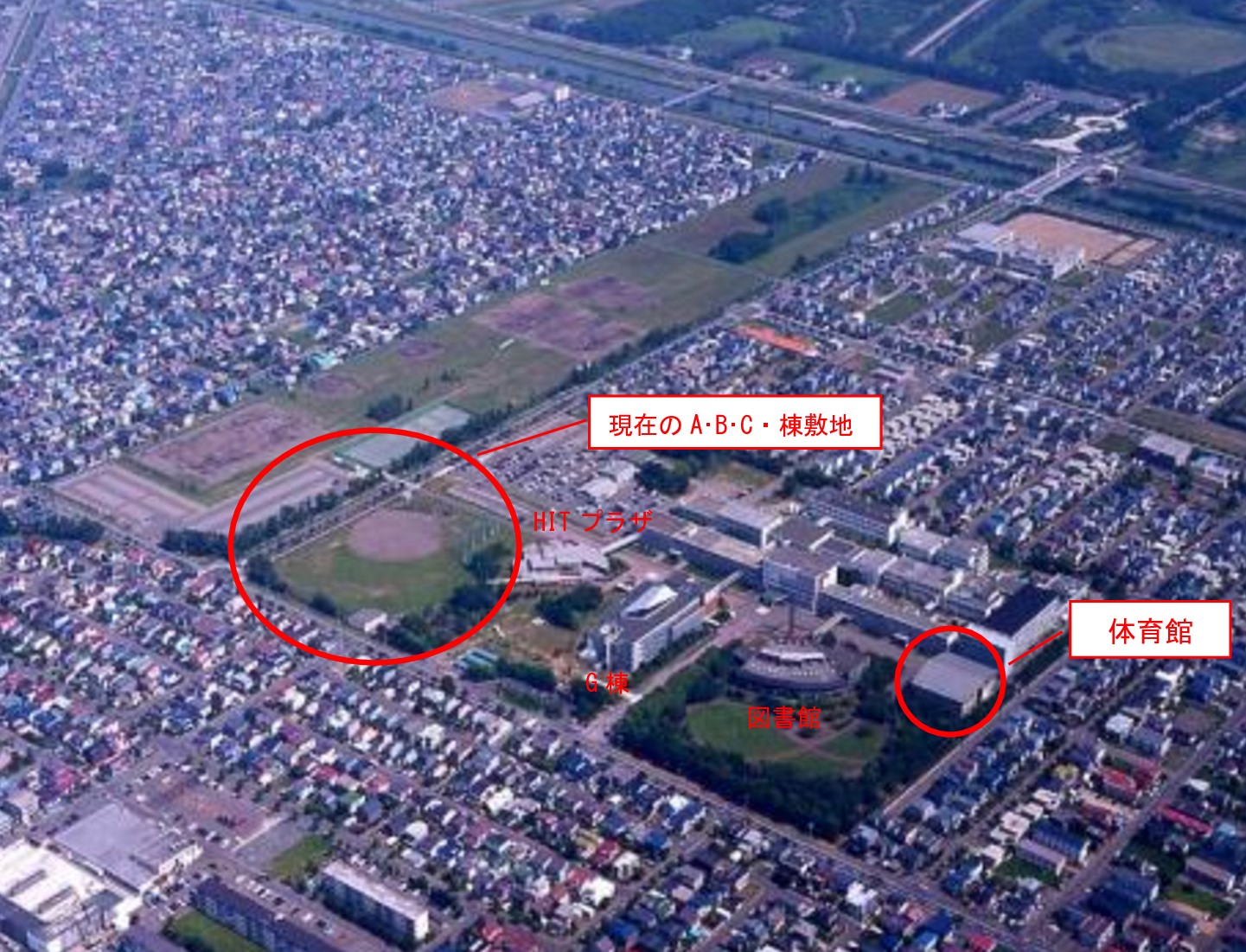 およそ20年前の校舎周辺の航空写真。体育館の位置が現在とは違いますね。