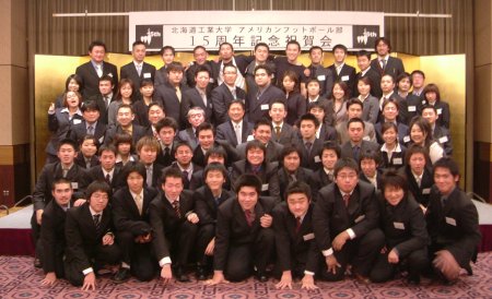 2003年12月20日,札幌ルネッサンスホテルにて,北海道工業大学アメリカンフットボール部創部15周年記念祝賀会が行われました。当日はOB,OG,関係者,現役含め67人の方々が集まりました。