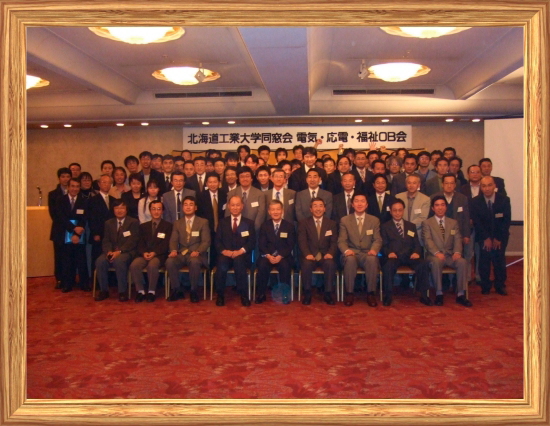 昨年の「土木・建築OB会」に引き続き、関東圏在住の電気工学科、応用電子工学科、福祉生体工学科の同窓生を対象とした「電気・応電・福祉OB会」が、11/5(土)17:30より新高輪プリンスホテルにて行われた。本会には、鈴木勝裕教授をはじめとして電気・応電・福祉に関係する9名の先生もお招きした。東京にて、3学科の合同交流会を開催することは初めてであり、久しぶりにお会いする先生や旧友との思い出話に花が咲いていた。また、有澤教授により、北海道工業大学の今昔についてご講演が行われ、参加者は昔の学生時代を懐かしむと同時に、生まれ変わった大学に驚かれていた。この会は2時間半で幕が閉じられたが、先生や旧友との久しぶりの再会で話が尽きず、ほとんどの方が2次会へと流れていった。