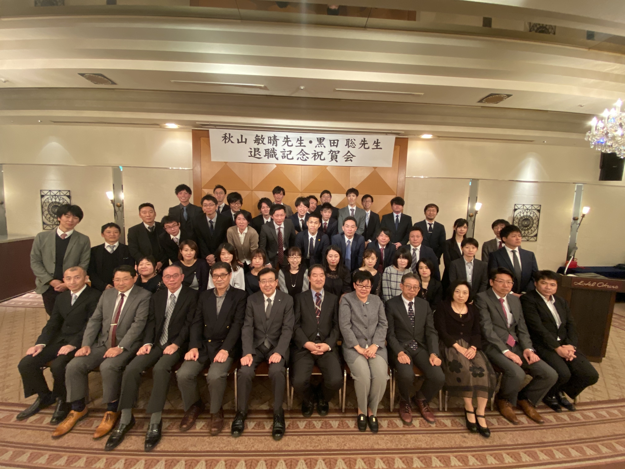 このたびは、昨年度でご退職された秋山敏晴先生・黒田聡先生の退職記念祝賀会も同時に行われ、卒業生・教員合わせて50名の出席となりました。