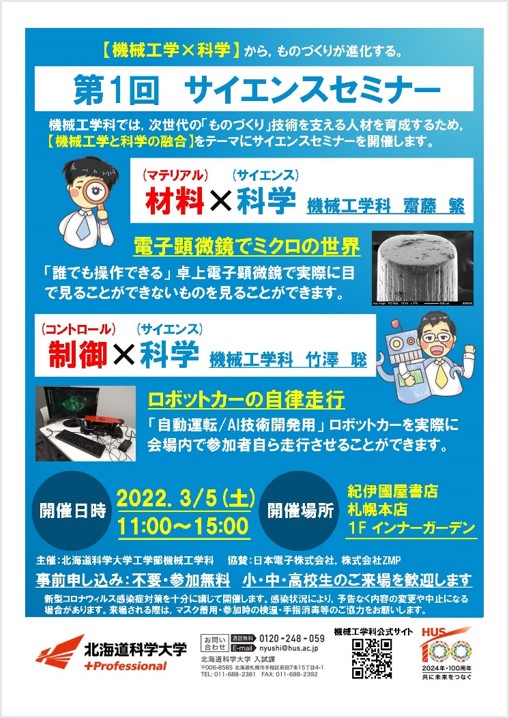 2022年3月5日(土)11時より、紀伊國屋書店札幌本店1階インナーガーデンにおいて、「北海道科学大学 機械工学科 第1回サイエンスセミナー」を開催します。