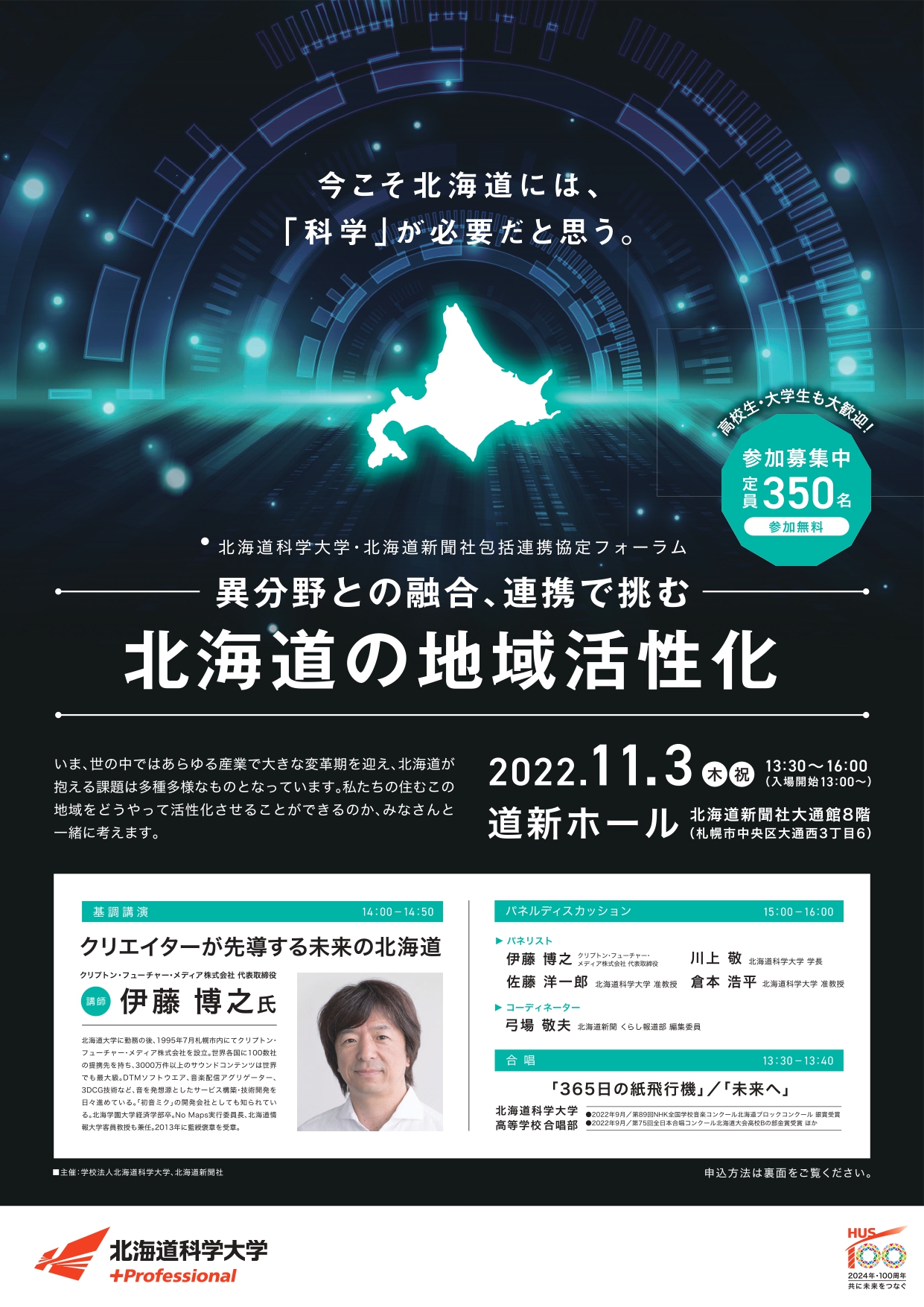 2022年11月3日(木・祝)、本学と北海道新聞社との包括連携協定フォーラム「異分野との融合、連携で挑む 北海道の地域活性化」を道新ホールで開催します。